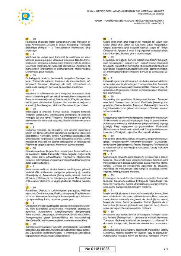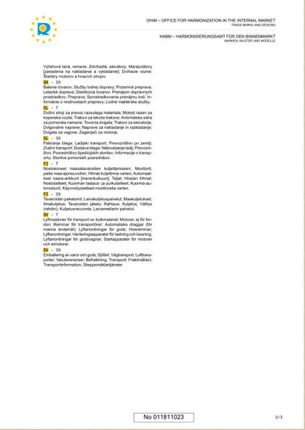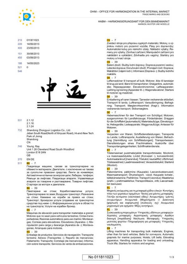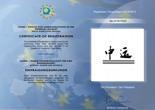 为进一步扩大国际市场,山东中运物流有限责任公司展开在欧盟申请注册“中运”商标的工作,欧盟商标体制是欧盟会议通过的一种在欧盟28个国家使用的商标体制。2013年9月,中运物流商标成功的在欧盟完成注册!就此敲开了中运物流在欧盟市场的大门!
