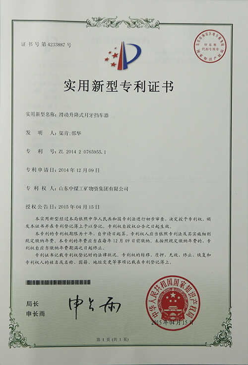 4月21日,经国家知识产权局严格审核批准,山东中煤工矿集团自主开发的滑动升降式月牙挡车器荣获实用新型专利证书。