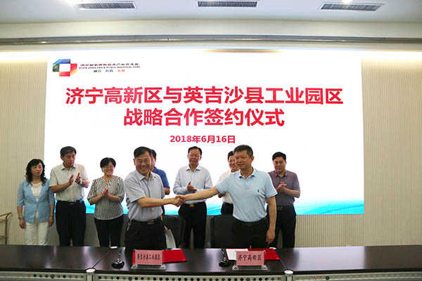 济宁高新区党工委副书记殷锋在会上介绍了济宁高新区有关情况。殷书记指出,济宁高新区一直把援疆工作摆在重要位置,牢固树立政治意识、大局意识、核心意识、看齐意识,围绕“社会稳定和长治久安”总目标,坚决贯彻中央援疆工作大政方针,集中物力财力,选派得力干部和人才全力支持援疆工作。下一步,济宁高新区将一如既往的重视和支持援疆工作,认真贯彻中央援疆工作座谈会精神,持续加大对英吉沙县支持力度,进一步加强交流合作,全力推动援疆工作取得新的更大成效。随后,喀什经济开发区、英吉沙县工业园区分别与济宁高新区签订战略合作协议。