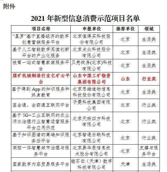 为贯彻落实《国务院关于进一步扩大和升级信息消费 持续释放内需潜力的指导意见》(国发〔2017〕40号),按照《工业和信息化部办公厅关于组织开展2021年新型信息消费示范项目申报工作的通知》(工信厅信发函〔2021〕27号)要求,经企业申报、地方推荐、形式审查和专家评审等环节,近日,工业和信息化部公布了2021年新型信息消费示范项目名单,中煤集团自主研发运营的煤矿机械制造行业亿矿云平台项目顺利入选。